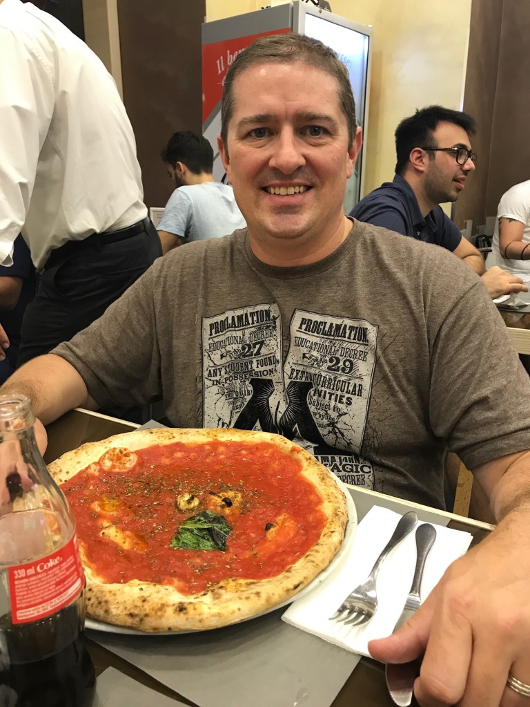 When we left for dinner that night, we left everything we could in the hotel. My husband and I normally travel with a few pieces of ScotteVest clothing that is specially designed for situations like this. The clothes have a ton of hidden pockets and most are only accessible from the inside of the clothes, to ward off pick pockets. He carried our passports, cash, and one phone all in his internal pockets. I also have a ScotteVest skirt, that has hidden pockets in the waist band. I guess without the luggage, we weren’t easy marks. No one bothered us on the way to dinner which was only a few blocks away. The pizza and other dishes were fabulous and despite the little bit of uneasiness I felt when we arrived, I was glad we added the stop in Naples.