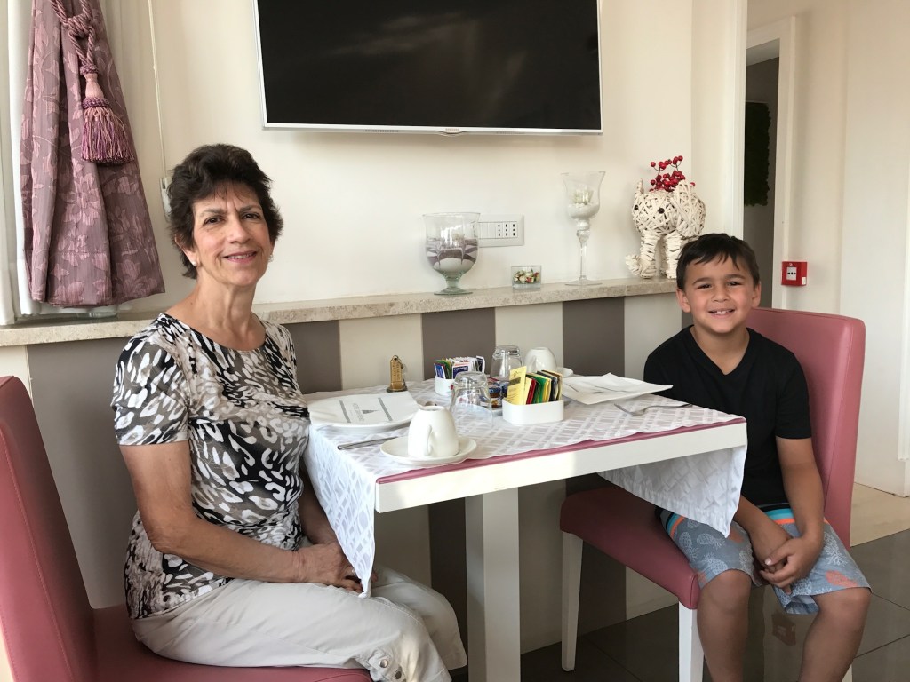 Our hotel was in an old renovated building. Everything was bright white with cheery pops of bright colors, the cost of the rooms was the lowest we paid for any this trip and I was pleasantly surprised by the decor and interiors. I was also very happy that I had opted not to have all 5 of us in the room for one night. Our family suite had two rooms, but the full glass shower was next to the master bedroom bed, which really amused the kids. The toilet and sink were frosted glass but not much better for blocking out anything. My mom had her own single room across the hall and enjoyed a night of peace and quiet.