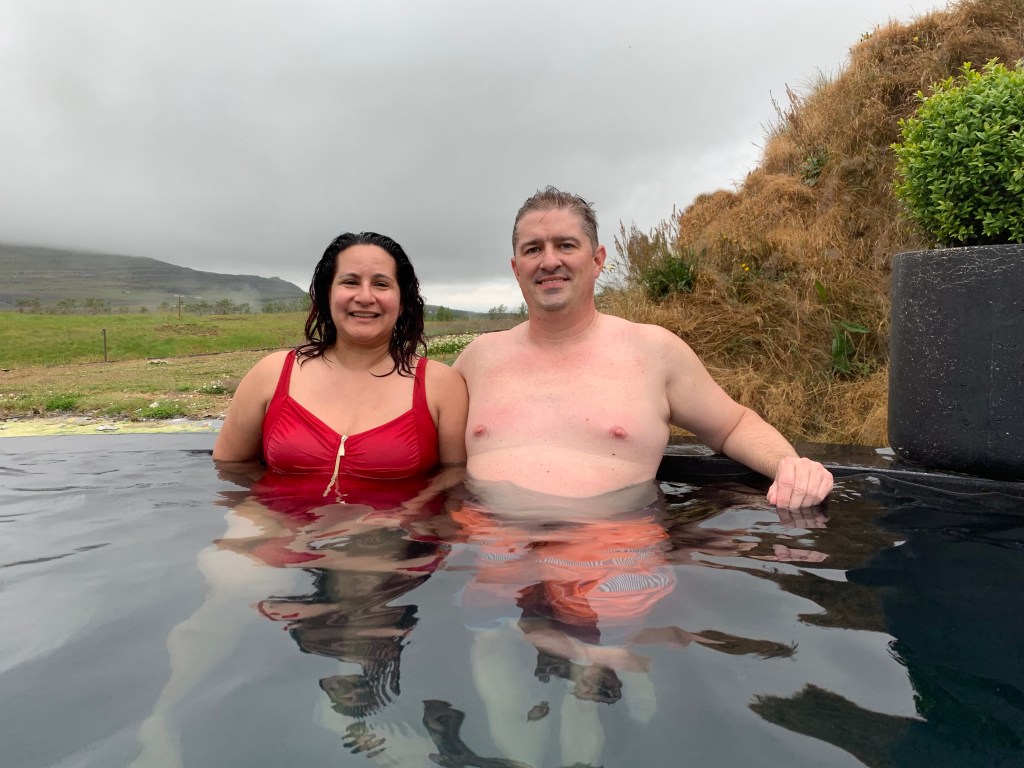 Krauma geothermal baths & spa is located in West Iceland, about 90 minutes drive from Reykjavík. Krauma looks like a spa that was designed by Batman; very modern looking, all in shades of smooth black and grey. There are 5 hot baths that vary in temperature, as well as one cold bath. In a separate building you can enjoy two steam baths. For additional serenity, you can enjoy the relaxation room where they play quiet music and with the warmth of a fireplace. An on site restaurant is also available, and you can get drink service out by the pools. We didn’t get to try the food on this visit because we stopped here after our Into the Glacier experience and lunch.