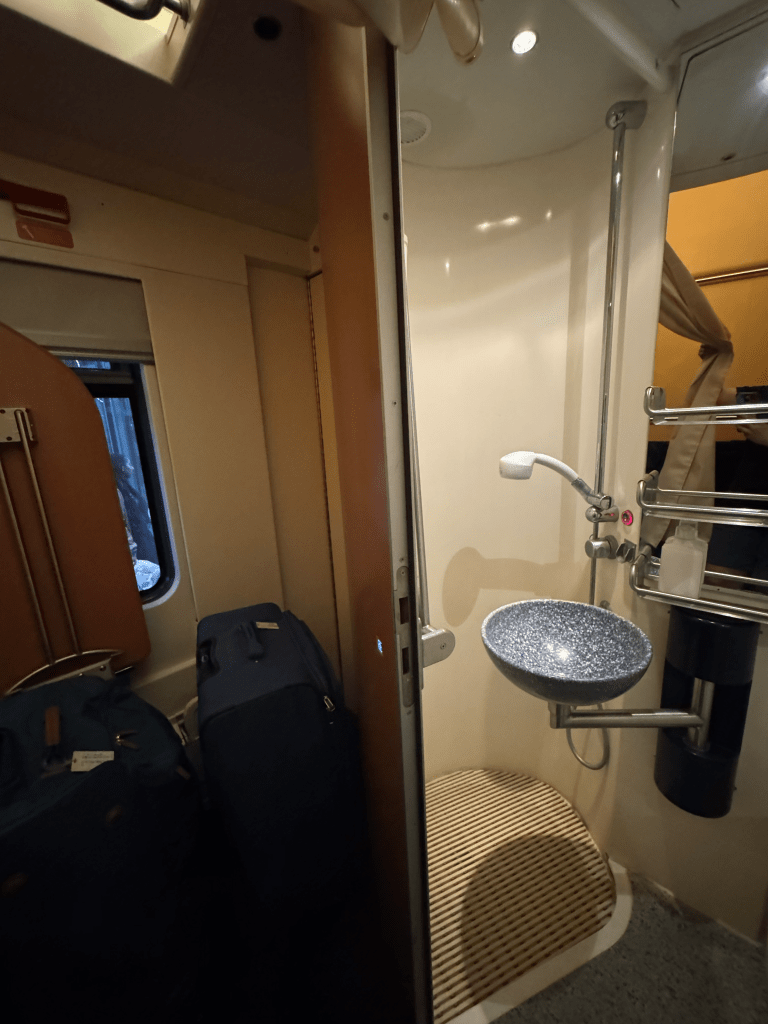 What began as a niche revival has grown into a large network of overnight train routes across Europe. Luxury icons like the Caledonian Sleeper and the Orient Express still roll on, but Austria’s OBB Nightjet has become a major player. They started with refurbished 1990s sleeper cars—shared cabins sleeping up to six, and private ones sleeping one to three. Some of the comfort cabins even come with en suite bathrooms. Families can book connecting cabins on certain routes, though in our case, I was grateful we didn’t—we needed the space in front of the connecting door for our carryons. After years of buzz, Nightjet’s sleek new futuristic carriages are finally hitting the rails on a few select routes… including, we believed, ours.