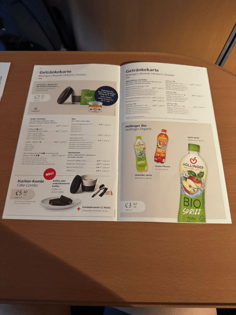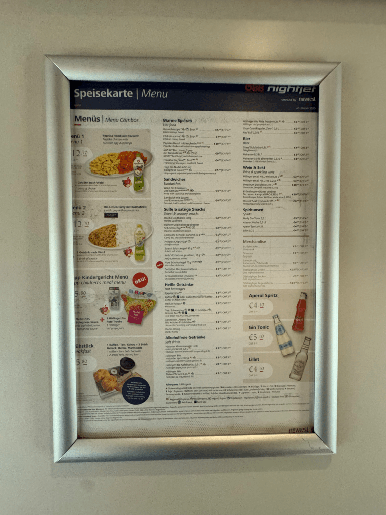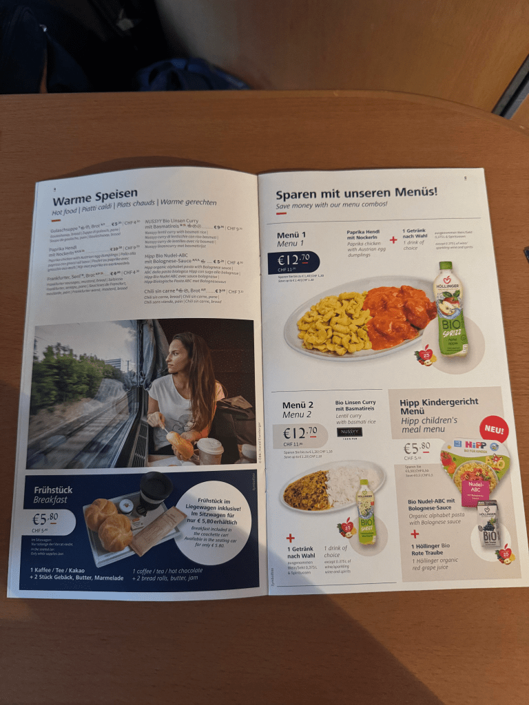 With bags finally stashed, our cabin attendant arrived to collect breakfast orders—comfort class includes a light morning meal. The OBB website also promised a dining car, which we were excited to try. There wasn’t one. The attendant offered a few sad microwave meals and one lone bottle of Coke Zero—which I took after asking for a regular Coke. Luckily, I’d packed a picnic.