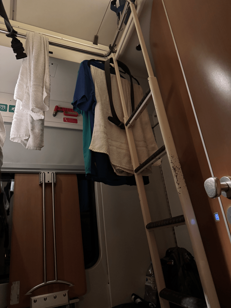 At 11:30 p.m., our cabin attendant set up the beds. Passengers aren’t allowed to convert them on their own. My husband and opted for the lower bunk and middle bunk to sleep. The boys opted for the middle and top—only to realize later the taller one didn’t fit comfortably in the highest bunk. If your planning on someone sleeping up there they probably should be no taller than 5’6” (or 1.68 m)
